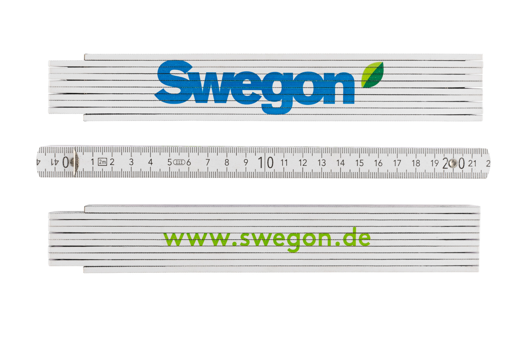 2 Meter Holzmaßstab Duplex mit 90° Einrastung in weiß mit Swegon Logo