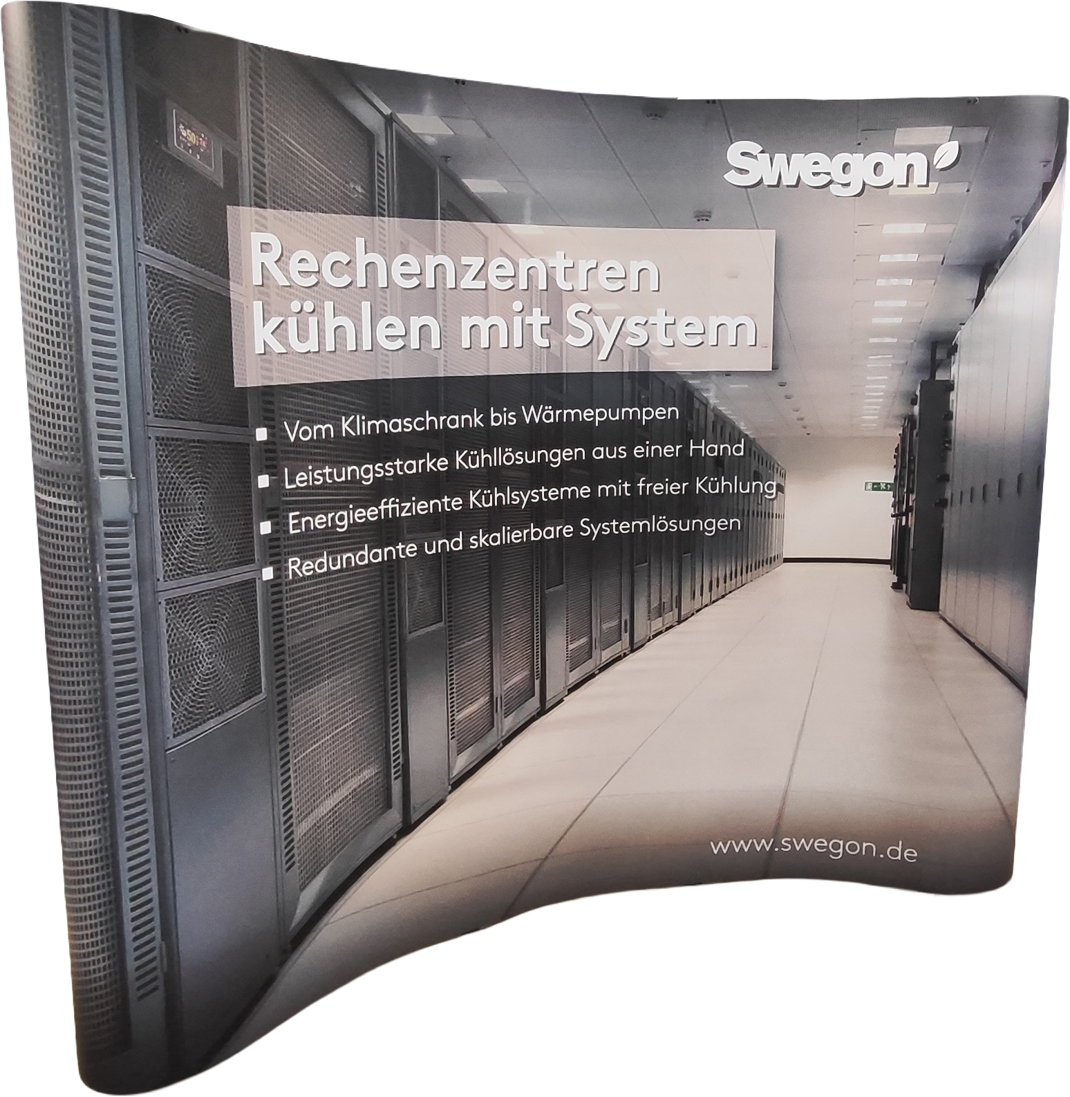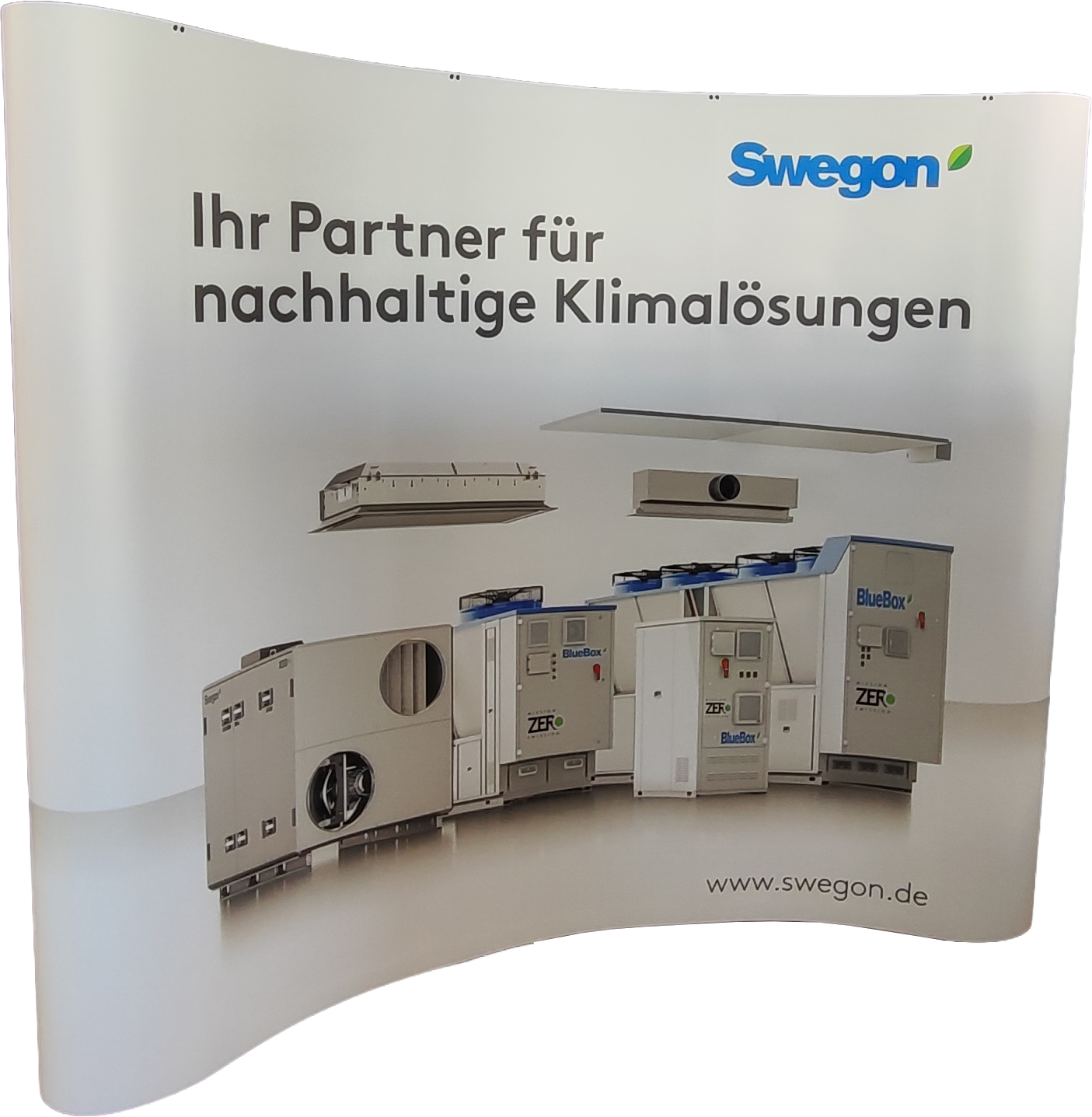 Mobiler Messestand mit Swegon-Branding für kleine Veranstaltungen.